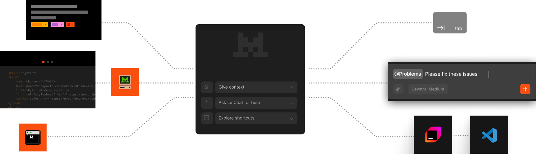 Вся мощь стека — автодополнение, поиск и агенты — становится доступной через Mistral Code, нативный плагин для VS Code и JetBrains IDEs.