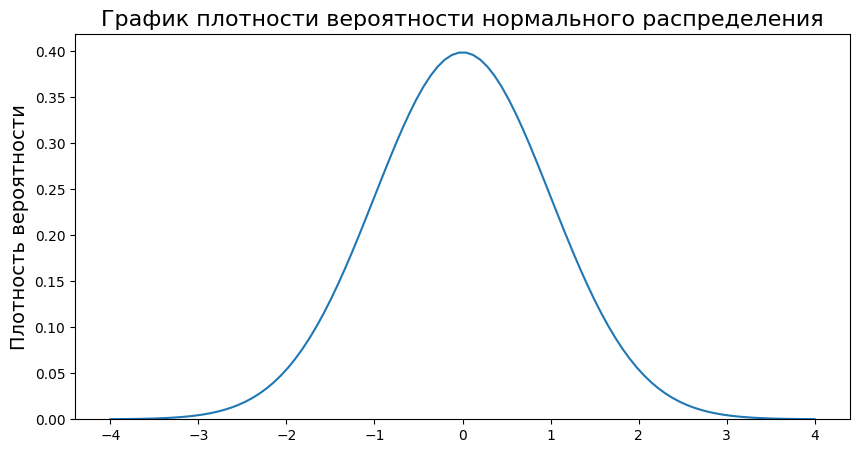 ax.set_title('График плотности вероятности нормального распределения', size = 16)