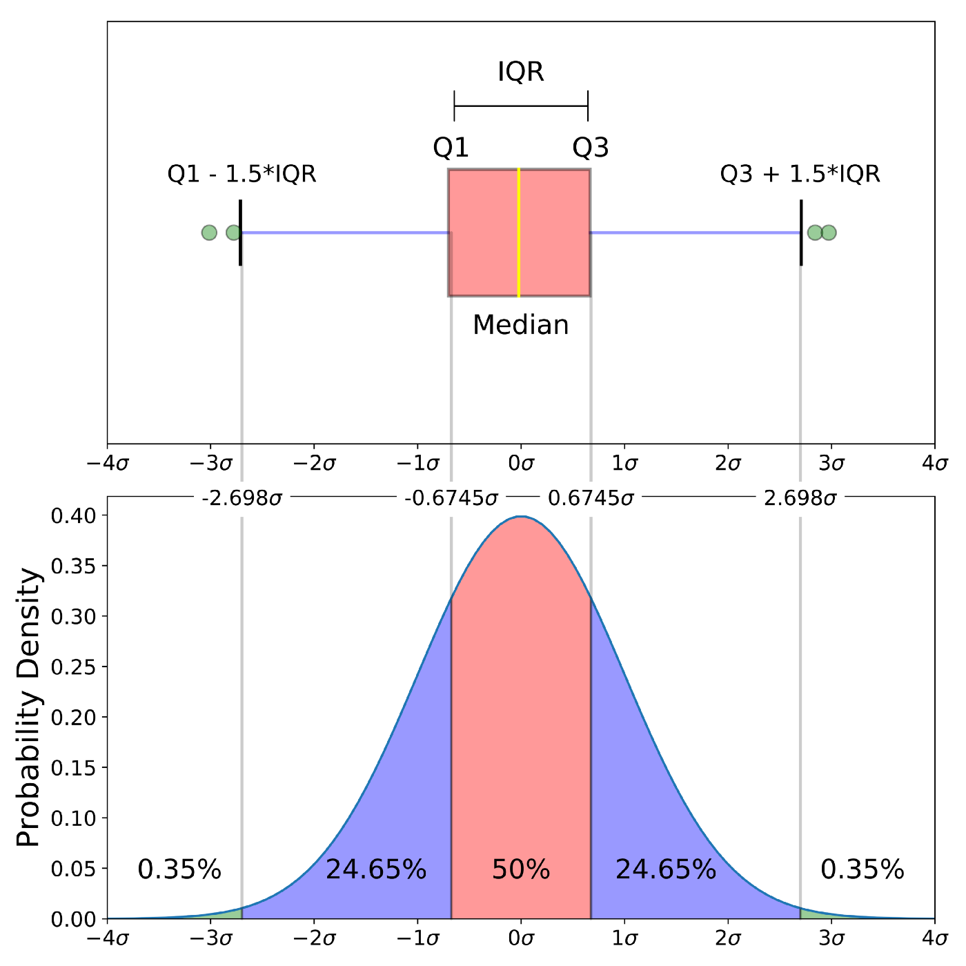 На рисунке выше показано, как части боксплота соответствуют областям под кривой плотности вероятности (Probability Density Function, PDF) для нормального распределения.