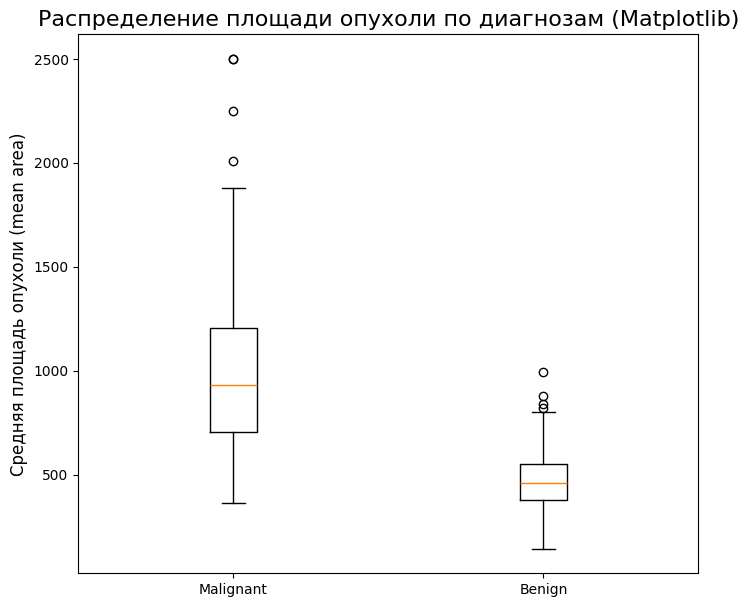 ax.set_title('Распределение площади опухоли по диагнозам (Matplotlib)', fontsize=16)